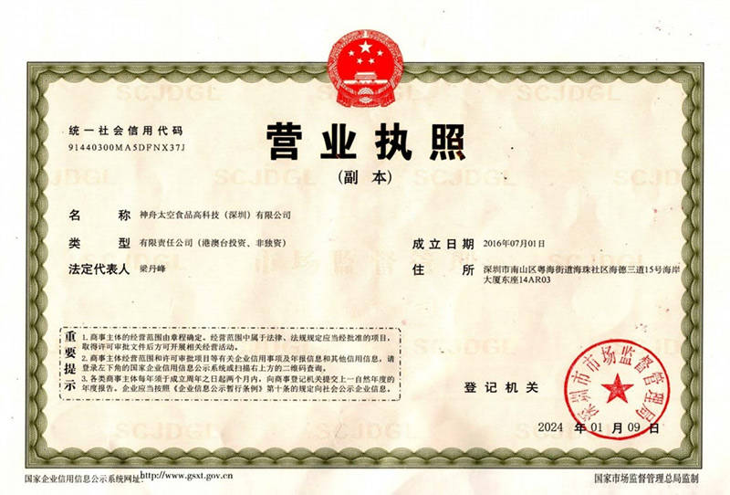 神舟太空食物高科技(深圳)无限公司独家具有中国航天员科研锻炼核心的空间坐航天员食物专利手艺——《空间坐航天员高能压缩食物及其制法》,